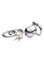 If you have no need for it, lock away your partners penis! This beautiful and unique chastity device wraps up that cock in tight stainless steel, leaving a number of holes open to allow for urination and airflow. Three different sizes of O-rings are included to find a comfortable or uncomfortable fit, depending on what your slave deserves. The most unique feature of this device, however, is the internal locking system. Insert the key into the brass keyhole and turn to straighten out the lock. The lock can then be inserted into the hinge. With another twist of the key, your slave will recognize your complete control.