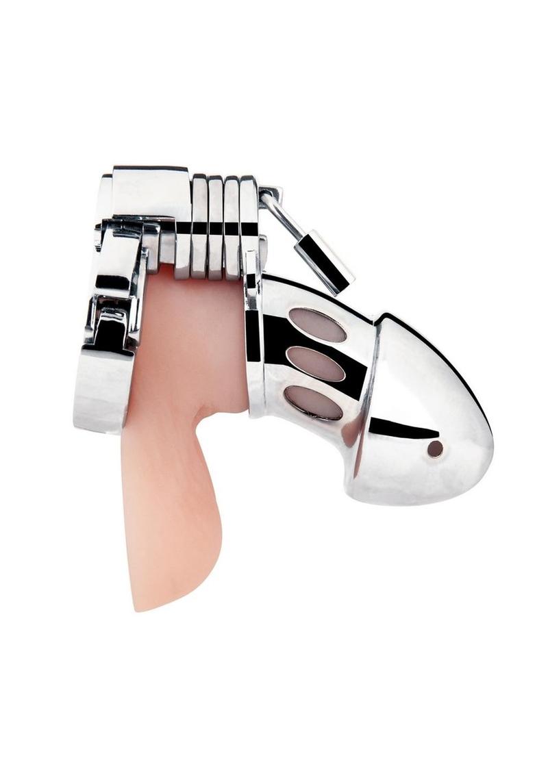 Take control of your partnerb s arousal with a cage that covers the top of his shaft with an almost solid sheath that also has openings for comfort. This cage is customizable to get the perfect fit. A separate ring goes around the testicles and spacers allow the wears to connect the ring to the shaftb s cage to ensure comfortable wear. Lock up your submissive to explore the intense pleasure of prolonging stimulation by denying his orgasm.